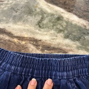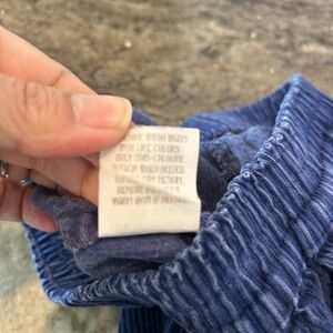 Navy corduroy trousers with elastic waistband. Features a playful patch on the leg. Vintage item, has wear. **item is in preowned condition/as is, how is/no warranties**
