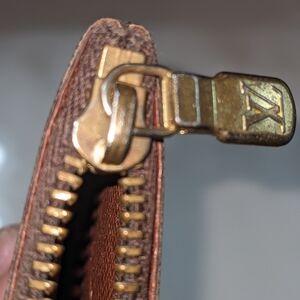 Elegant Louis Vuitton pouch with classic monogram. Rich brown and tan design.