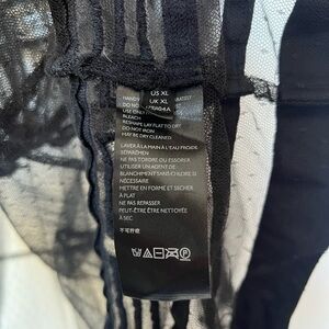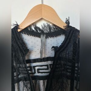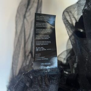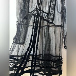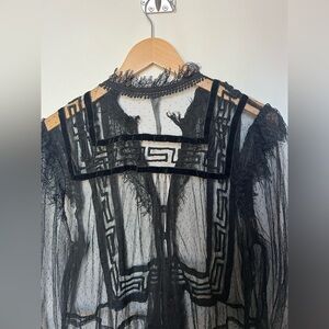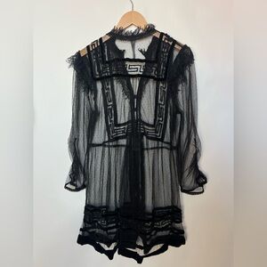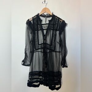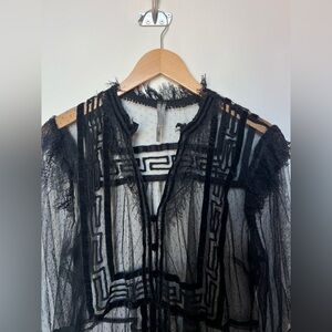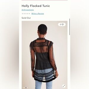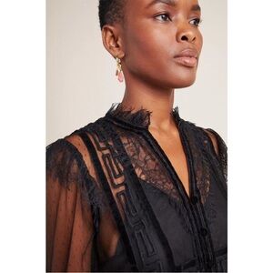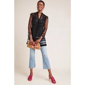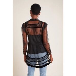 Anthropologie Holly flocked tunic top in sheer black mesh with dramatic velvet-style flocking throughout. Features a delicate dotted mesh base layered with bold geometric velvet detailing, creating striking contrast and texture. Designed with a ruffled mock neckline, subtle puffed shoulders, and sheer long sleeves with softly gathered cuffs. Button-front closure and an easy tunic-length silhouette that feels romantic, gothic, and editorial all at once. Lightweight, airy, and intentionally sheer.