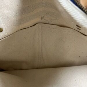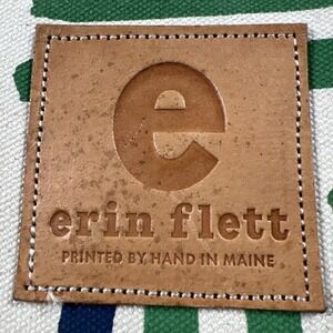 The Anthropologie Erin Flett Folder Canvas Bag in Ivory features a geometric pattern with a zip closure and double brown leather handles. Made from matte coated canvas this tote bag is perfect for travel and casual occasions. The beige hardware and gold tone accents add a touch of elegance, making it a stylish and practical choice for women looking for a versatile handbag. PLEASE NOTE SOME DISCOLORATION ON BOTTOM LEFT. PIC 4.