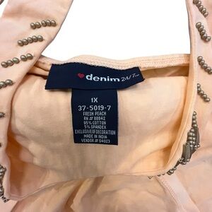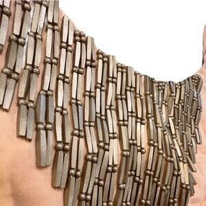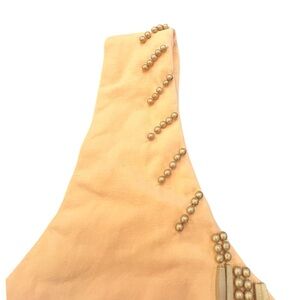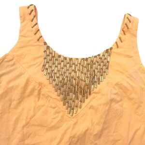 Stylish peach sleeveless top featuring a unique mesh detail at the neckline. Perfect for casual outings.