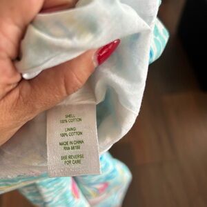Elegant white dress by Lilly Pulitzer. Features a pink tag detail.