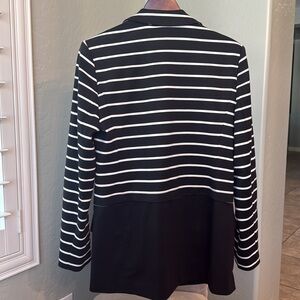 Stylish black blazer with white stripes. Perfect for a chic look.
