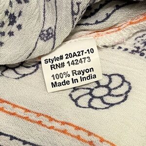 This gorgeous whimsical white and navy print with orange and pink accents is breezy and lightweight - just what you want and need for warmer weather. The raglan sleeves gather at the wrists for an easy, versatile fit and the side slits make sure you stay comfortable whether you style as a front-tuck, knotted, or loose and flowy.