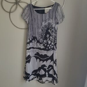 Johnny Was For Love and Liberty elegant black and gray silk dress with sequin detail. Features floral and abstract patterns. Short sleeves with a flowing silhouette...lined. Excellent pre-loved condition. Size S. 17" PTP and 38" top to bottom.