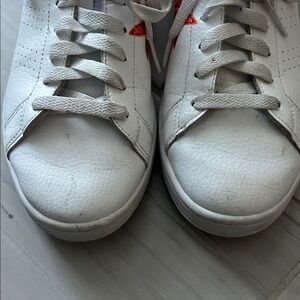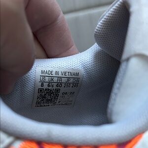 Stylish Adidas sneakers with bold orange accents. Ideal for everyday wear. Have been worn a few times- there are marks- look at pics carefully
