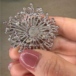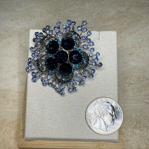 This is a vintage style flower brooch with deep blue glass surrounded by vibrant teal and light blue rhinestones in a silver setting. It features a dimensional, stylized floral design with a cluster of large center stones surrounded by smaller spiky stones that give a starburst look.