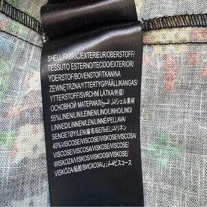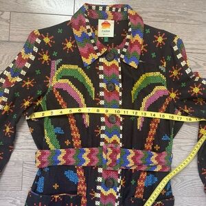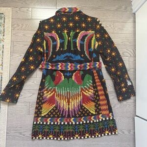 Vibrant Farm Rio shirt dress with a bold, colorful pattern. Features patterns from nature such as palm trees, parrots and sun bursts. Shirt dress has long sleeves and button-down front. Includes a matching belt for a fitted look.