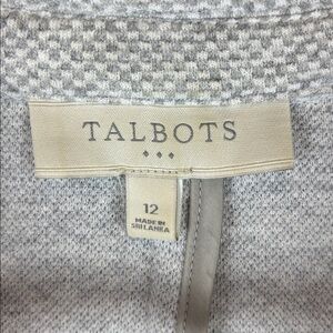 Talbots knit blazer in a heathered light gray, size 12. Soft structured cotton-blend with stretch — the perfect polished-casual layer for work, weekends, and business casual outfits. Two-button front, patch pockets, and comfortable sweater-like feel.