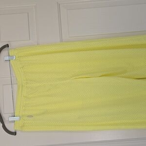 Bright yellow track pants. Lightweight and breathable. Elastic waistband with drawstring.