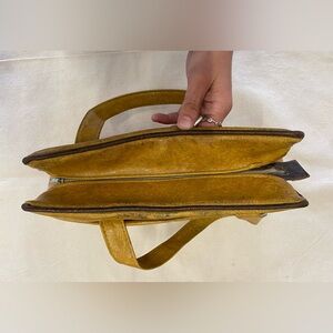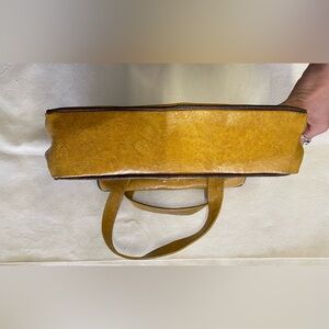Stylish yellow faux leather handbag featuring a unique 3 leaf design. Perfect for adding a touch of vintage nature-inspired whimsy to your outfit. In fair used condition with plenty of life left. Would be great for a prop/costume! Has one small rip near the zipper and the interior has some visible gaps. Definitely in need of a spa day.