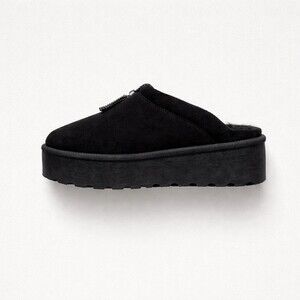 These LINZO-7 platform clog slippers make cozy look polished. The black faux suede upper keeps it sleek, while the sherpa-style faux fur lining and insole feel warm the second you slip in. A closed-toe mule shape, easy pull tab, and rubber outsole mean you can lounge in comfort or run quick errands without changing shoes. Perfect for home, travel, or casual weekends. Condition: New in box.