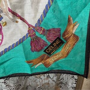 Elegant Celine handkerchief with horse and carriage, design featuring blue tones. Celine branding adds a touch of luxury. Minor stain, see picture