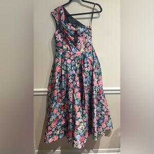 Tags: Garden Party, Wedding Guest, Floral Core, Regencycore, Old Money Aesthetic, Quiet Luxury, One Shoulder, Pleated Midi, Tea Party, Summer Gala, High-End Designer, Contemporary, Shoshanna Midnight, Size 6.