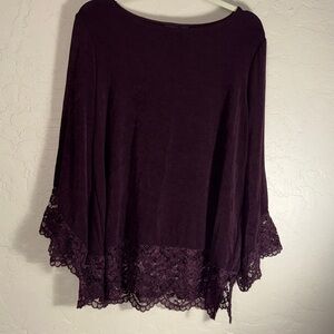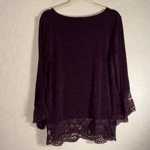 Travelers by Chicos women’s bell sleeves lace trim tunic top. Burgundy, Eggplant purple color. Lots of stretch. Size 2. Approximate measurments