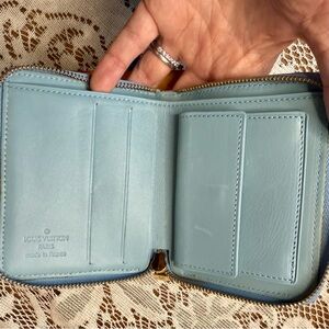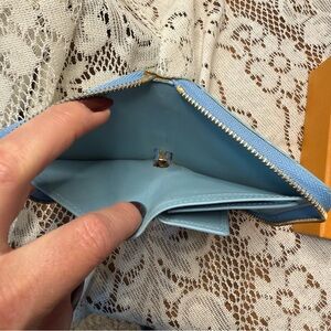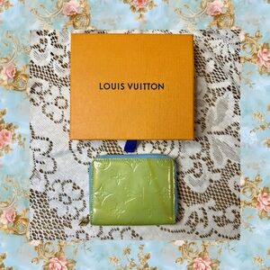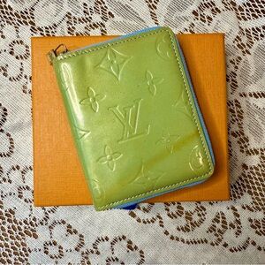 Chic Louis Vuitton wallet in lime green Vernis and blue zipper. Blue leather inside. Features iconic monogram design. Compact and stylish for everyday use.