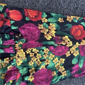Vibrant floral dress with long sleeves. Features a mix of red, pink, yellow, and green colors. Perfect for a bold statement look.
