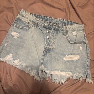 Cute and edgy Vanilla Star distressed denim mini skirt featuring a raw, frayed hem and light wash denim. Classic 5-pocket style with button fly and belt loops. Perfect for summer, concerts, bachelorette trips, beach days, or casual everyday wear.