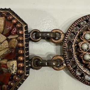 Elevate your look with this gorgeous vintage-inspired mosaic stone link belt. This piece features a striking alternating pattern of octagonal and circular medallions, each inlaid with a beautiful mosaic of natural stone chips including blue lapis, turquoise tones, and earthy whites.