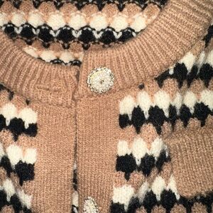 Features a beautiful brown, tan, cream, and black patterned knit with elegant pearl-style buttons for a luxe, Parisian-inspired look.