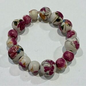 Elegant floral ceramic beaded bracelet featuring vibrant pink and white hues. Perfect for adding a touch of color to any outfit. Stretchable. Handmade. Vintage with minor signs of wear and age. Pretty rose design.