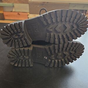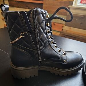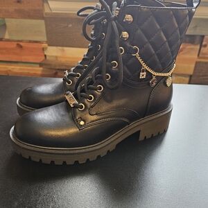 Sleek black combat boots with quilted design. Features gold-tone chain and charm accents. Durable and stylish for any outfit.