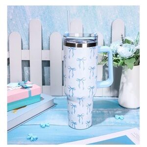 Stylish travel mug with a blue bow pattern. Features a sturdy handle and secure lid.
