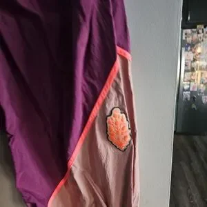 Features: Nylon fabrication, mocked elastic waistband with adjustable drawcord, slip pockets on front and back, cinched bottom hems