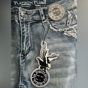 💀✨ Make a statement in these edgy Platinum Plush bootcut jeans featuring bold skull & wing embroidered back pockets with rhinestone and stud detailing. Classic Y2K / biker glam vibes with a flattering bootcut silhouette.