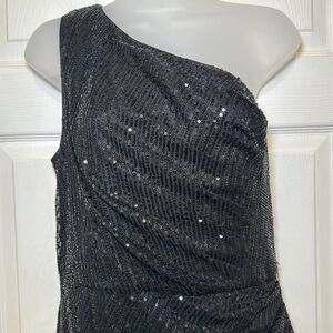 **Dress is missing matching sequin belt. In my opinion, the dress is equally beautiful without it. String belt loops are still attached to dress. They could be removed or black satin ribbon could be used.**