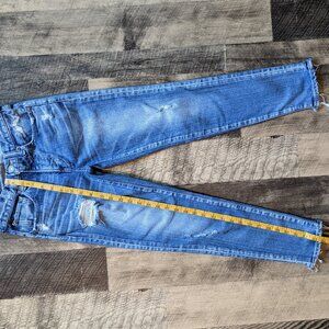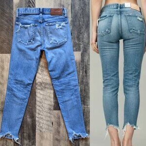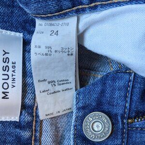 These are Moussy Vintage Jeans in a light blue color. They are in excellent condition. They are a size 24, and the last two images show measurements. Mid-rise with a skinny fit and cropped length. Denim fabric with a hint of stretch, made of 99% cotton and 1% spandex. Cowhide leather brand label. Intentional fading and whiskering, with distressed details including shark-bites at the back of the hems. Five-pocket style, zip fly with button closure, made in Japan. Style# 010BAC12-2710