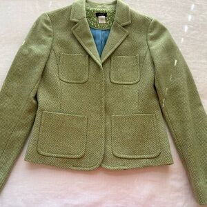 Sophisticated and classic houndstooth blazer by Giorgio Armani. Features a classic black and tan pattern. Double pockets and double front zipper. Tailored and feminine, this elegant piece is ideal for professional and casual settings. Excellent used condition with very light wear on zipper hardware. Size 6.