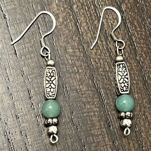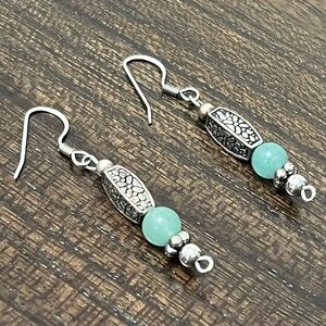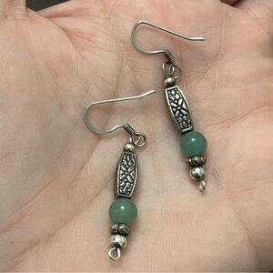 These elegant dangle earrings feature a beautiful combination of silver and green, perfect for adding a touch of sophistication to any outfit. The intricate silver detailing complements the green accents, making them a versatile accessory for any occasion.