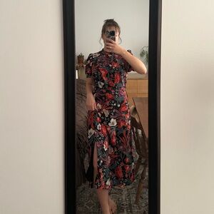 Julia Jordan floral print midi dress with short puff sleeves and mock neck #floraldress #weddingguestdress