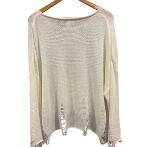 Boho Comfy Distressed Knit Ivory White Poncho Peasant Sweater, Women's Medium