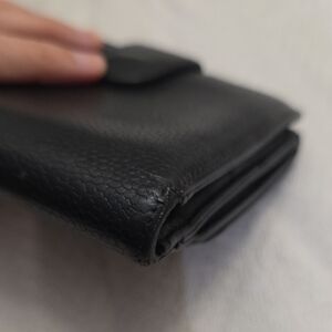 Sophisticated CHANEL wallet in black pebbled leather. Features iconic logo embossing. Compact and stylish.