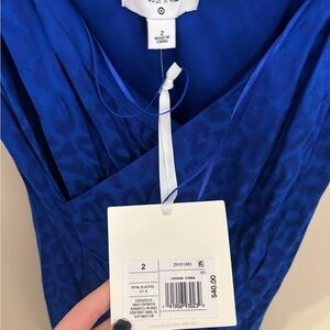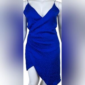 Keywords: Cushnie, wrap dress, slip dress, knee-length, blue, leopard print, party dress, cocktail dress, V-neck, tulip hemline, spring fashion, elegant fit, tie closure, women's fashion, new with tags.