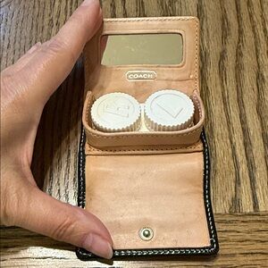 Sleek black leather contact lens case by Coach. Features signature logo detail. Compact and stylish.
