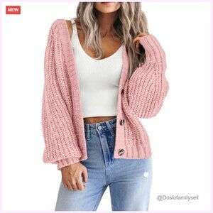Chunky Knit Cardigan Open Front V Neck Button Long Sleeve Loose Fit Sweater