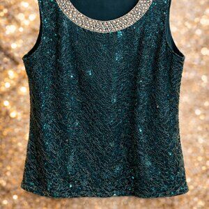 Add sparkle to your wardrobe with this gorgeous emerald green sleeveless tank from NY Collection. Featuring a sequin overlay and delicate lace detailing with an embellished, banded neckline, this top is perfect for evenings out, holiday parties, or any occasion that calls for a little shimmer.