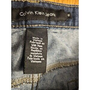 The product is a pair of Calvin Klein Jeans women's high rise wide leg fit blue denim bootcut jeans in size 12. These jeans feature a zip closure, belt loops, and a 5-pocket design. Made from a cotton blend fabric with a medium wash, they are machine washable and suitable for all seasons. The wide-leg style and modern theme make them a fashionable and versatile choice for any woman's wardrobe.