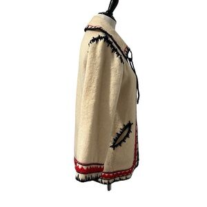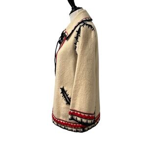 Stylish vintage cream cardigan wool jacket featuring bold red and blue trim. Perfect for adding a pop of color to your outfit. Winter, warm, festival, bohemian, artsy, academia,