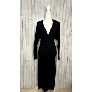 Good American Women's Black Ribbed Knit V-Neck Midi Dress Size 4 Long Sleeve