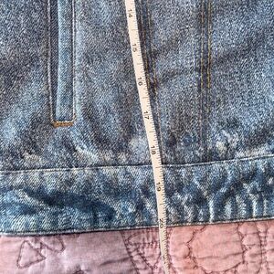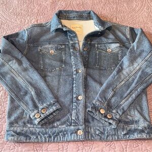 Anybody Printed Denim Effect French Terry Jacket. Top chest pockets are printed on, while hip pockets are functional. Functional Metal buttons like on a real Jean jacket. See photos for measurements. XS. Worn a few times, it is like a button up sweatshirt.