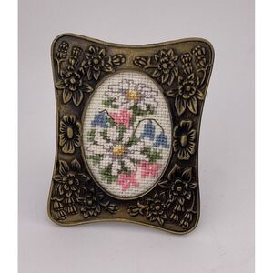 A charming miniature oval photo frame with an ornate bronze tone finish. This unique frame cradles a delicate cross-stitch floral design featuring pink, blue, and white flowers with green leaves and a small bird. The frame has a decorative embossed floral border and includes a small metal easel stand on the back for display.