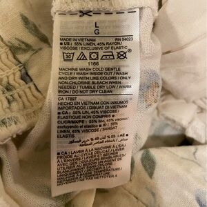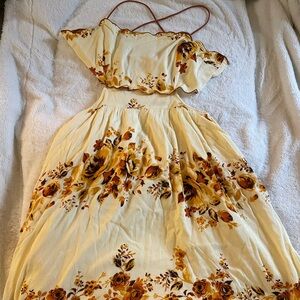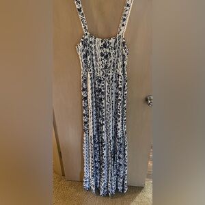 Adorable cream jumpsuit with a delicate blue floral pattern. Perfect for any occasion — wearing as is and getting some sun or dress it up with a light cardi! All wrinkles will be steamed before shipping!