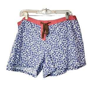 Boden Mixed Print Sleep Short With Brown Drawstring Waist. It Has A Flat Front And An Elastic Back. It features a faux button fly and the bottom portion is Blue Floral with Pink Polka Dot Waist. It has small slits on the leg and a large pink pocket on the back. Size 16
