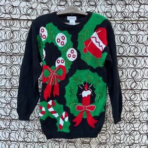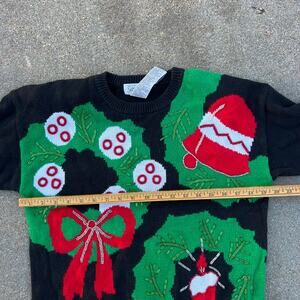 Vintage 90s Christmas Wreaths Bows Bells Bead Ugly Sweater Tunic SMALL
