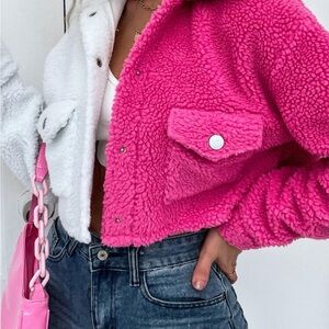 Stay stylish and cozy with this chic two-tone jacket. Featuring a vibrant pink and classic white design, this jacket is perfect for any casual outing. Elevate your wardrobe with this versatile piece.