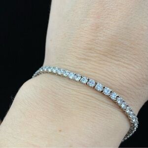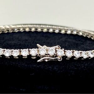 This stunning silver tennis bracelet adds a touch of elegance to any outfit. Perfect for any occasion.